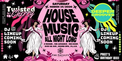 Come get twisted and deep with us as we heat up the dance floor and usher in spring with the March edition of TCDG! This time we celebrate another trip around the sun for resident DJ, I AM PREETY! Preet started out her DJ career at Faculty and has quickly become a crowd favourite and we at Faculty adore her! Come give a happy birthday high 5, stay for the good music all night