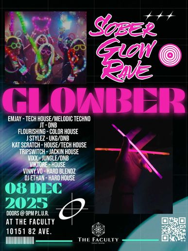 Glowber is coming — and it’s about to light up Whyte Ave like never before! On December 5, The Faculty transforms into a two-room Sober Glow Rave bursting with neon energy, immersive décor, and a crowd that glows as hard as they dance. Step inside a world drenched in ultraviolet color, with glowing installations, radiant art pieces, and dance floors designed to ignite your senses. Come dressed in neon, white, or anything that reacts to blacklight—this is the night to sparkle, shine, and stand out. Prepare to be mesmerized by the Pyromystiques, delivering a dazzling glow-and-flow performance that mixes hypnotic movement, LED wizardry, and fire-inspired artistry (without the fire!) to elevate the night’s vibe into something surreal. Thirsty? Wander over to the non-alcohol bar serving delicious crafted mocktails and other suculant sips or boost your vibe at the tasty Energy Shot Bar—just the fuel you need to keep glowing till the last beat drops. Expect glow-up giveaways, surprise swag, and a multi-genre DJ lineup weaving many genres into a pulse-pounding sonic journey across both rooms. Glowber isn’t just a rave—it's a radiant, sober celebration of music, community, and expression. Dec 5. The Faculty. Get ready to shine.