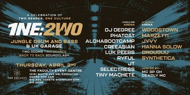 1NE:2WO brings Edmonton’s Jungle, Drum & Bass, and UK Garage communities together for a night of bass music across two rooms at The Faculty Event Centre.